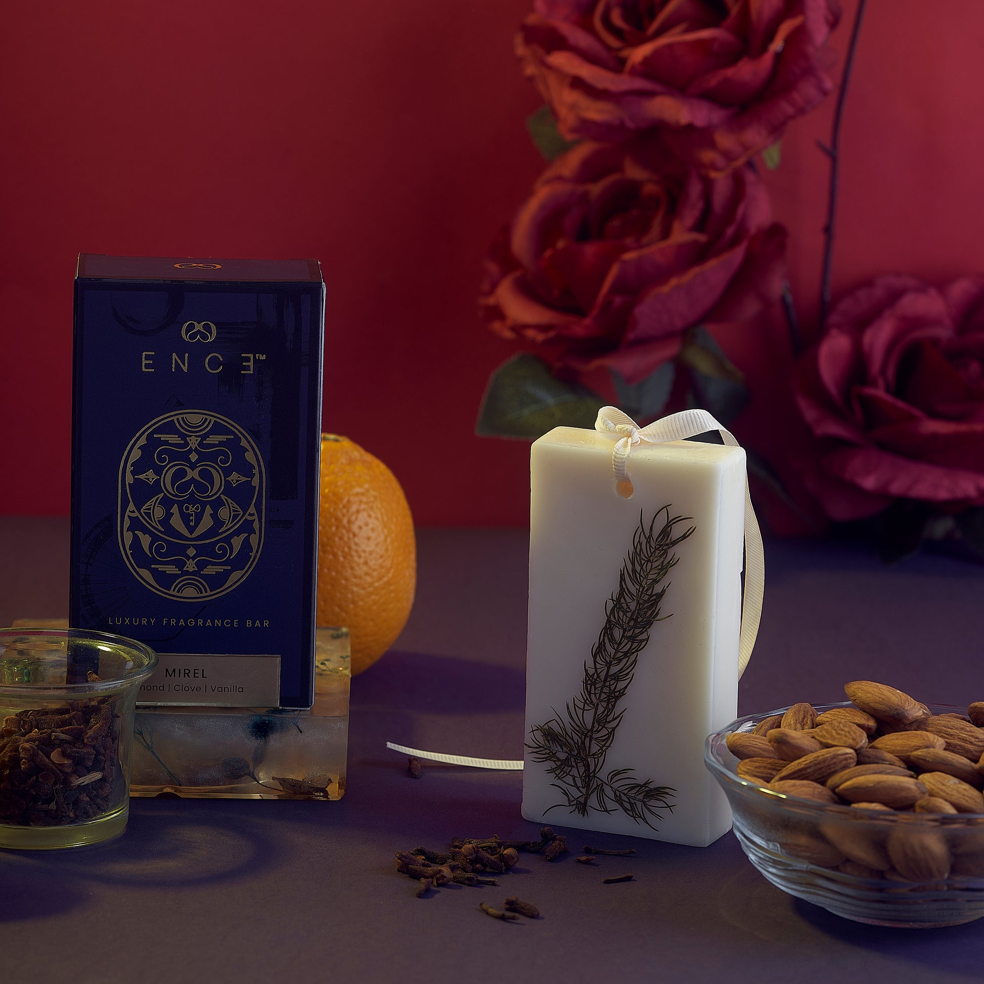 A statement of considered taste from ENCE's Luxury Collection: Mirel layers Almond against the deep elegance of Clove, hand-poured by women artisans in India using ethically sourced botanicals. The heart opens warmly through Indian Damask Rose, Cinnamon & Clove, before settling into a cosy, intimate finish. Luxury that whispers. Every detail considered. Every note intentional.